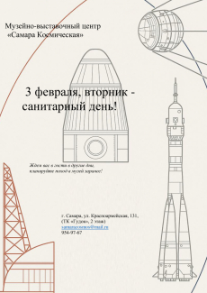 Дорогие друзья! Внимание! 3 февраля, в первый вторник месяца, в музее - санитарный день. Планируйте поход в музей заранее. Рады видеть вас на выставках "Самары Космической".